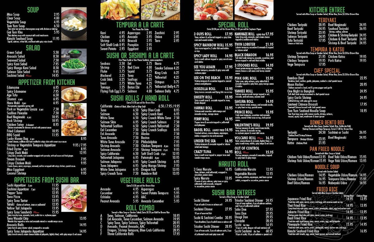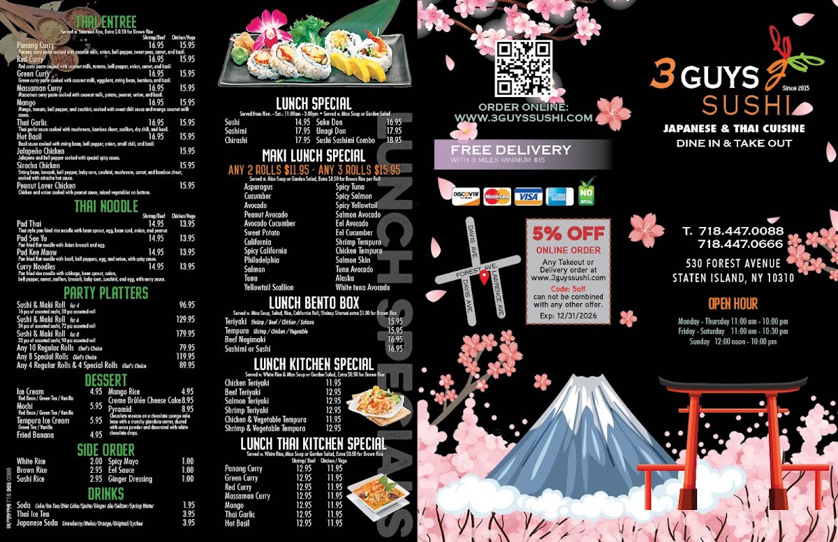 At 3 Guys Sushi on Forest Avenue, the menu presents a vibrant fusion of Japanese, Thai, and Taiwanese flavors that caters to both casual diners and sushi aficionados. For starters, the Vegetable Rolls like Sweet Potato Tempura Roll and Asparagus Roll pair beautifully with Clear Soup or the spicy tang of Tom Yum Soup. The Roll Combos, including Roll Combo A, B, C, and D, offer a generous assortment of flavors, while the Special Rolls such as the Dancing Salmon Roll, 3 Guys Roll, and Spicy Rainbow Roll highlight the chef’s creativity. Those seeking heartier options can indulge in Kitchen Entrees like Seafood Teriyaki, Beef Negimaki Diner, and Chicken Teriyaki, or opt for Sushi Bar Entrees such as Sushi Dinner and Tricolor Sashimi Dinner. Hot dishes like Shumai and Pork Gyoza, along with Fried Rice varieties including Pineapple Fried Rice and Jakarta Fried Rice, complement the menu’s extensive noodle offerings, from Nabeyaki Udon to Beef Yaki Udon/Ramen. Cold dishes, including Yellowtail Jalapeno Roll and Spicy Tuna Tartar, balance the menu alongside Taiwanese snacks like Takoyaki and Popcorn Chicken. For desserts, options like Cheese Cake, Mango Rice, and Fried Banana satisfy the sweet tooth, while the Vivi Bubble Milk Drinks and Flavored Teas provide refreshing beverages. Bento boxes such as Katsu Bento Box (D) and Sashimi Or Sushi Bento Box (D) offer complete meals, and Sushi or Sashimi A La Carte selections like Ikura and Smoke Salmon allow for customization. From Tempura & Katsu dishes to Naruto Rolls including the 3 Guys Naruto Roll and Spicy Tuna Naruto, and fresh Sushi Rolls / Hand Rolls like Philadelphia Roll and Tuna Avocado Roll, the menu showcases a diverse range of mains, sides, and salads such as Seaweed Salad and Salmon Skin Salad. With inventive mains like Bamboo Beef and Spicy Garlic Shrimp Moon Harbor, plus Thai Noodle specials like Pad Thai and Curry Noodles, diners are treated to a comprehensive, flavorful experience that emphasizes both variety and quality across every category.
